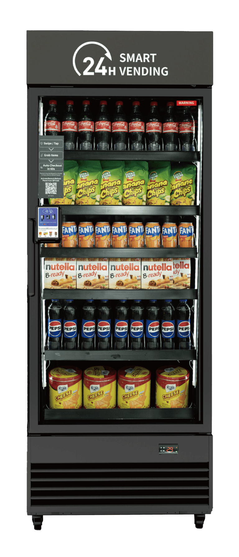 Almost any item larger than baby’s fist that can fit into the machine can be sold, including beverages, snacks, yogurt, fruits, boxed meals, etc.